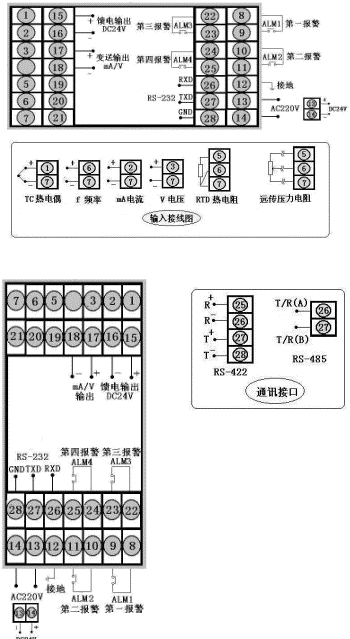 SWP-C801/SWP-C803系列和SWP-S801/SWP-S803系列數(shù)顯表接線圖: SWP-C401/SWP-C403系列和SWP-S401/SWP-S403系列數(shù)顯表接線圖: SWP-C901/C903系列數(shù)顯表接線圖: SWP-C701/SWP-C703系列數(shù)顯表接線圖: SWP-C101/SWP-C103系列智能數(shù)顯表接線圖: