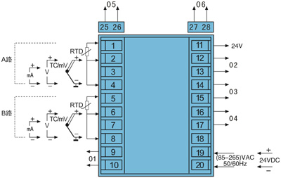 三、DY2000雙通道全分度信號數(shù)字/光柱顯示儀接線圖: