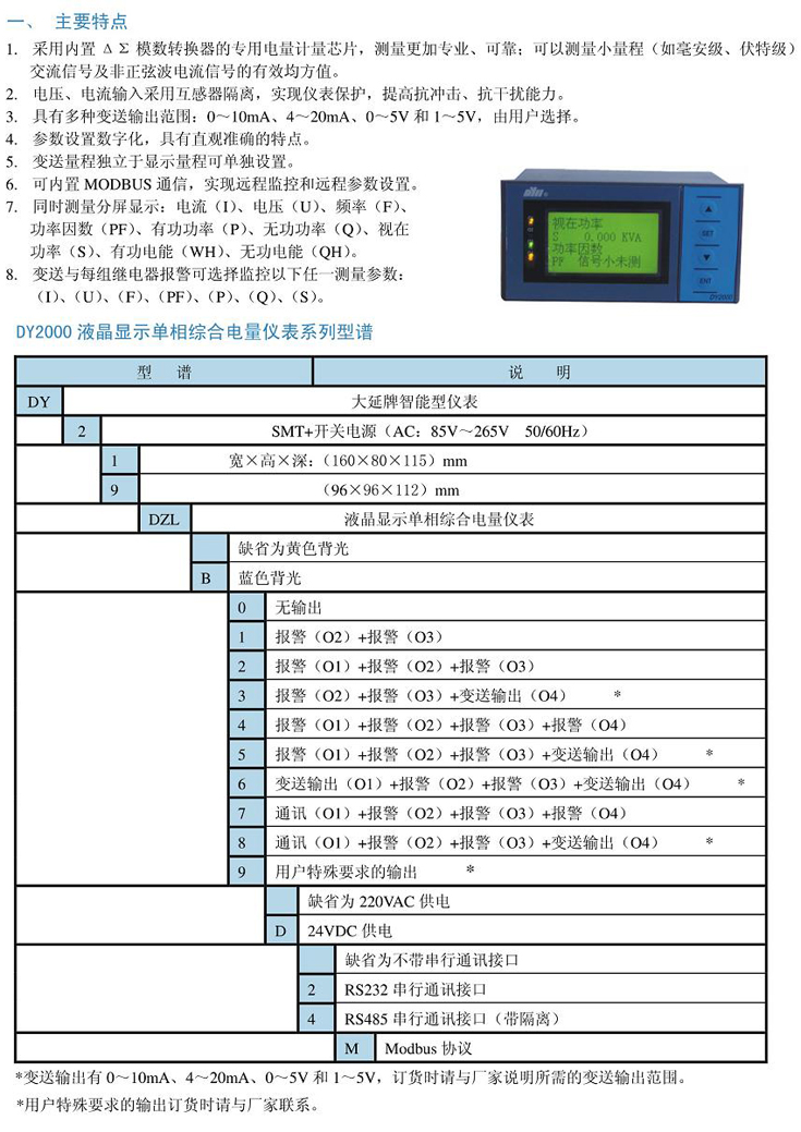 • 產(chǎn)品名稱:DY2000(DZL)液晶顯示單相綜合電量儀表